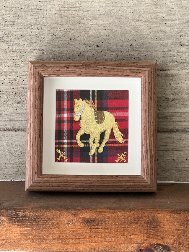 赤いタータンには“情熱”“繁栄”“祝福”などの意味があります。そんなタータンの上を駆けるゴールドの馬が幸運を運んできそうなラッキーチャームのような作品です。 【技法】 金彩 【主な使用材料】 樹脂糊 箔 【フレーム】 内径:100㎜×100㎜ フレーム内:15㎜中空 強化ガラス 正方形