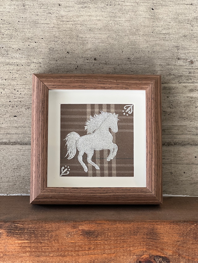 ベージュには“落ち着き”“希望”などの意味があります。そんなチェックの上を駆けるシルバーの馬が幸運を運んできそうなラッキーチャームのような作品です。 【技法】 金彩 【主な使用材料】 樹脂糊 箔 【フレーム】 内径:100㎜×100㎜ フレーム内:15㎜中空 強化ガラス 正方形