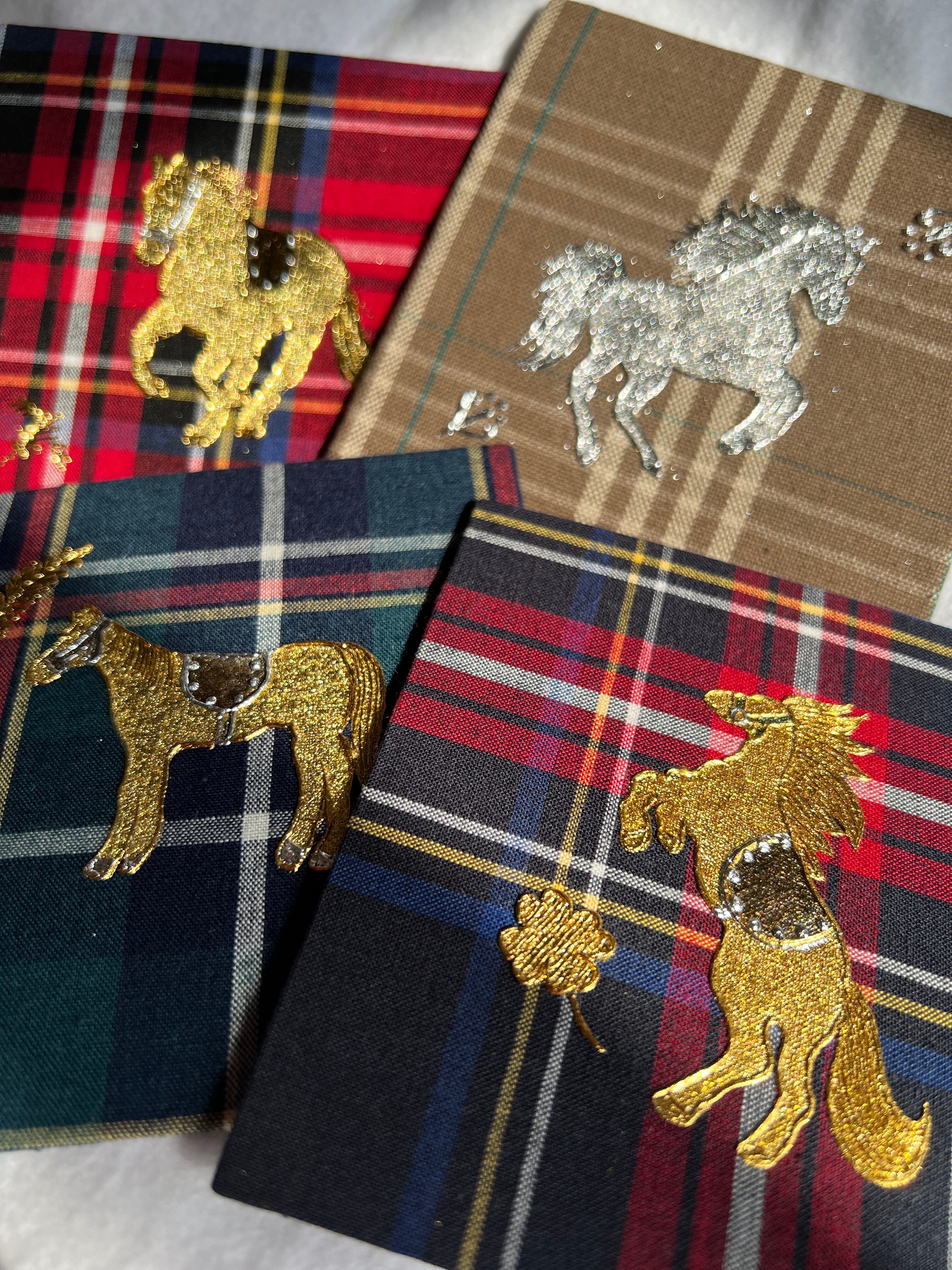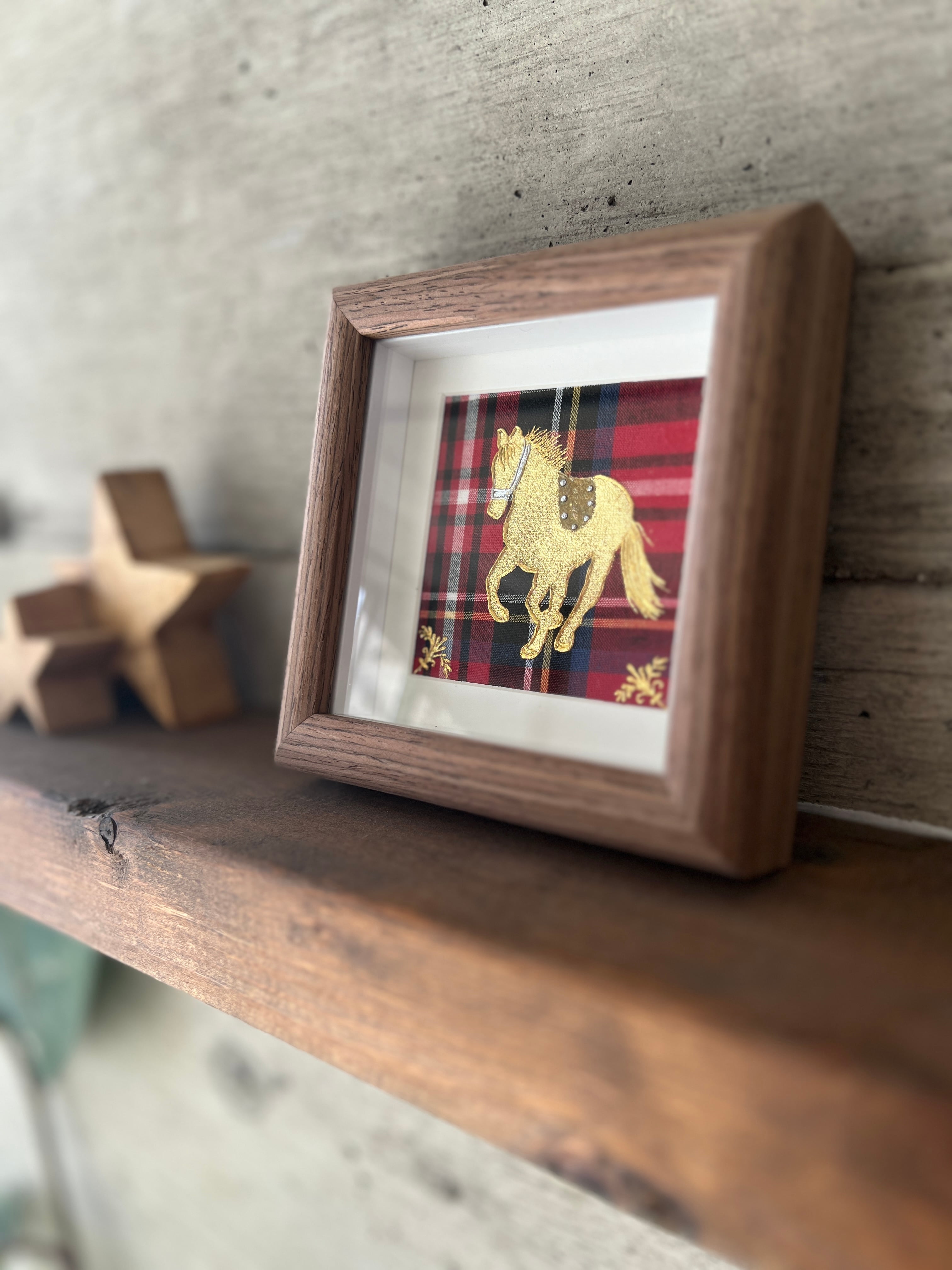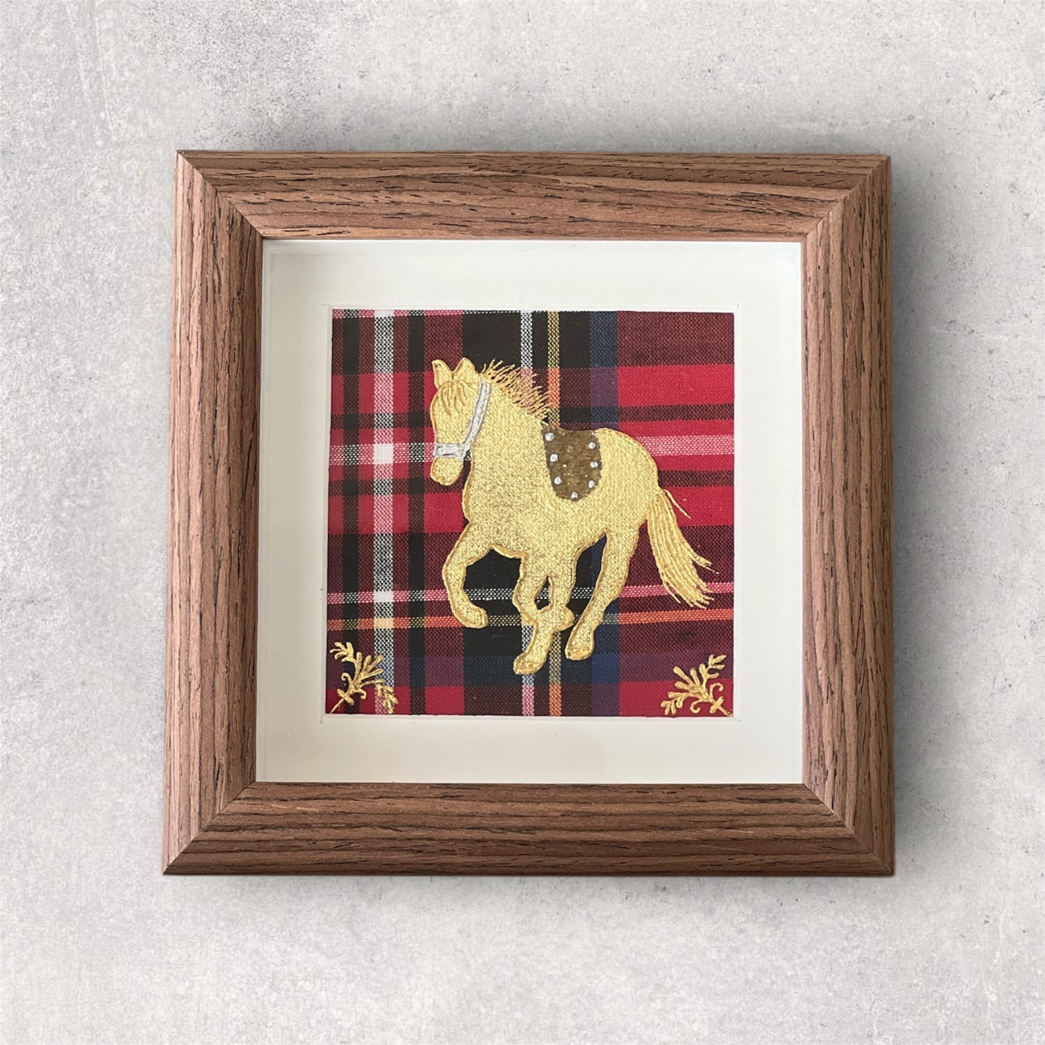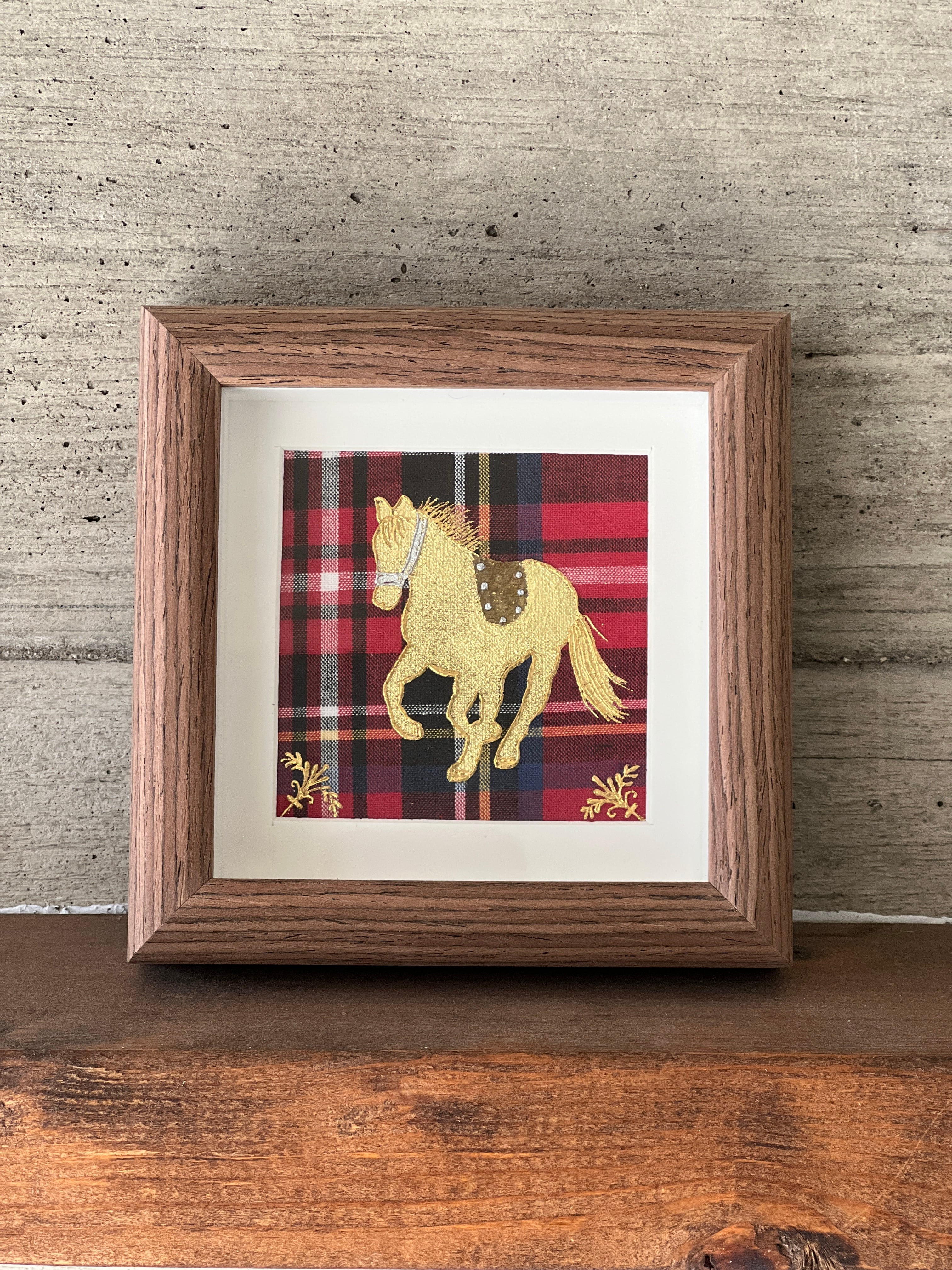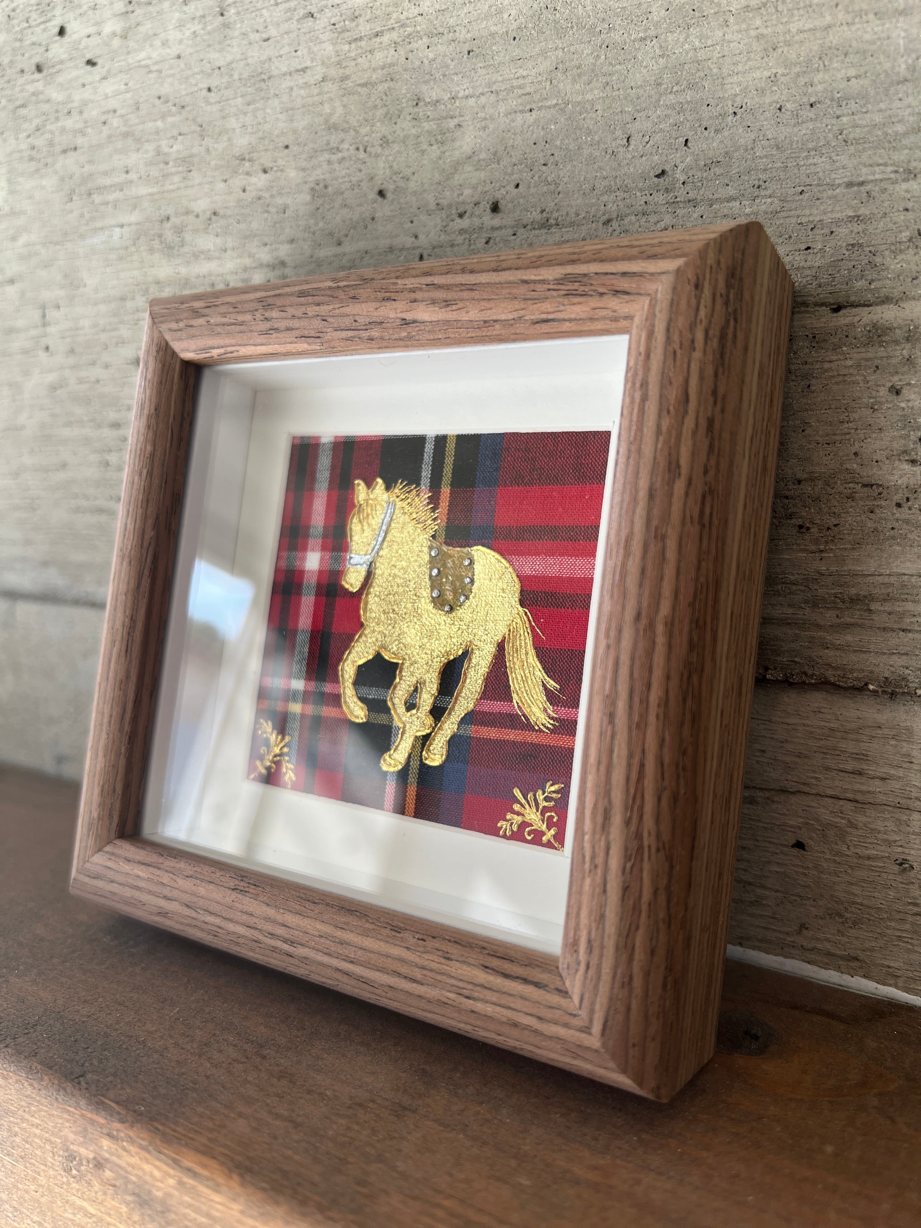 赤いタータンには“情熱”“繁栄”“祝福”などの意味があります。そんなタータンの上を駆けるゴールドの馬が幸運を運んできそうなラッキーチャームのような作品です。