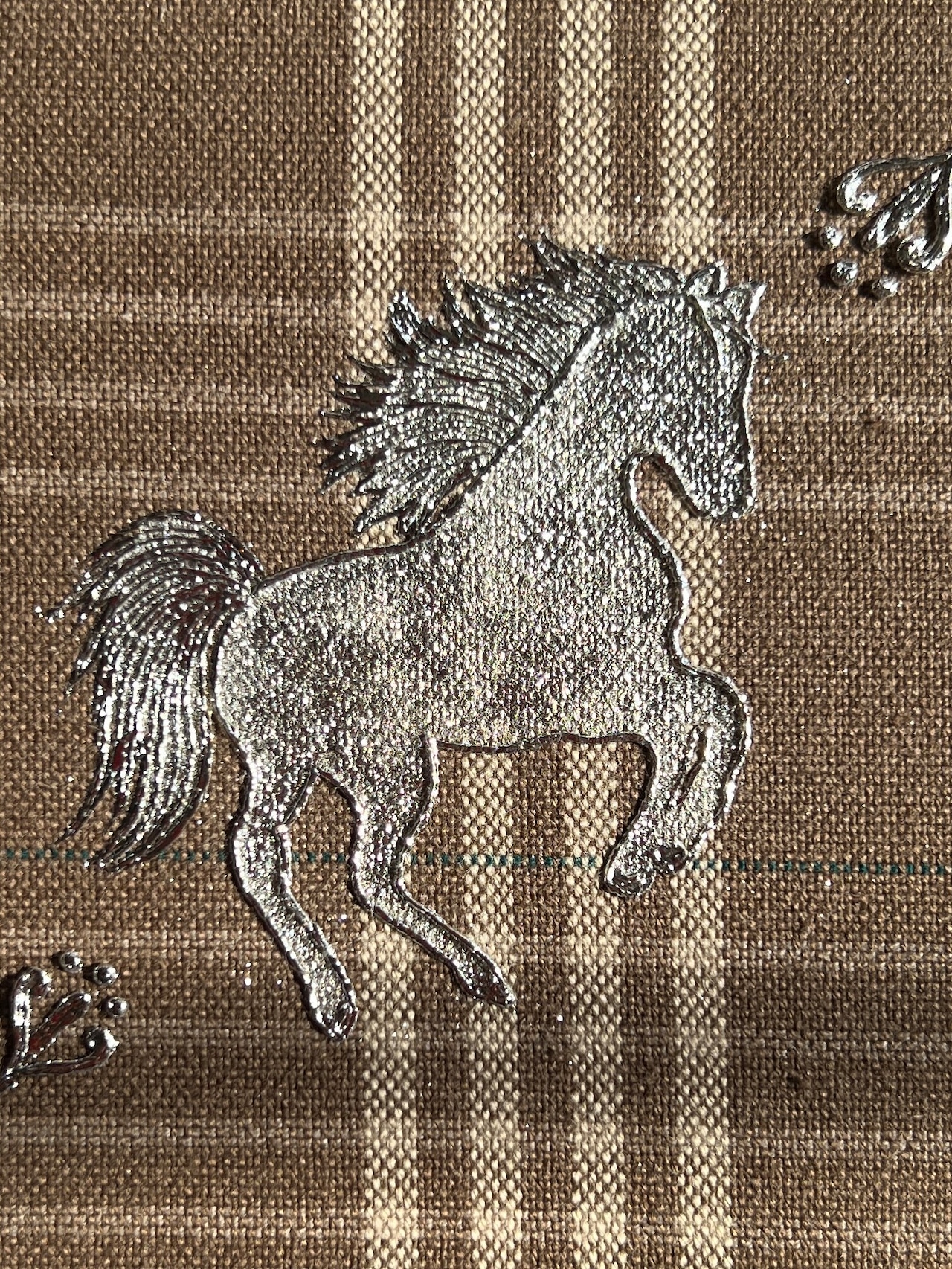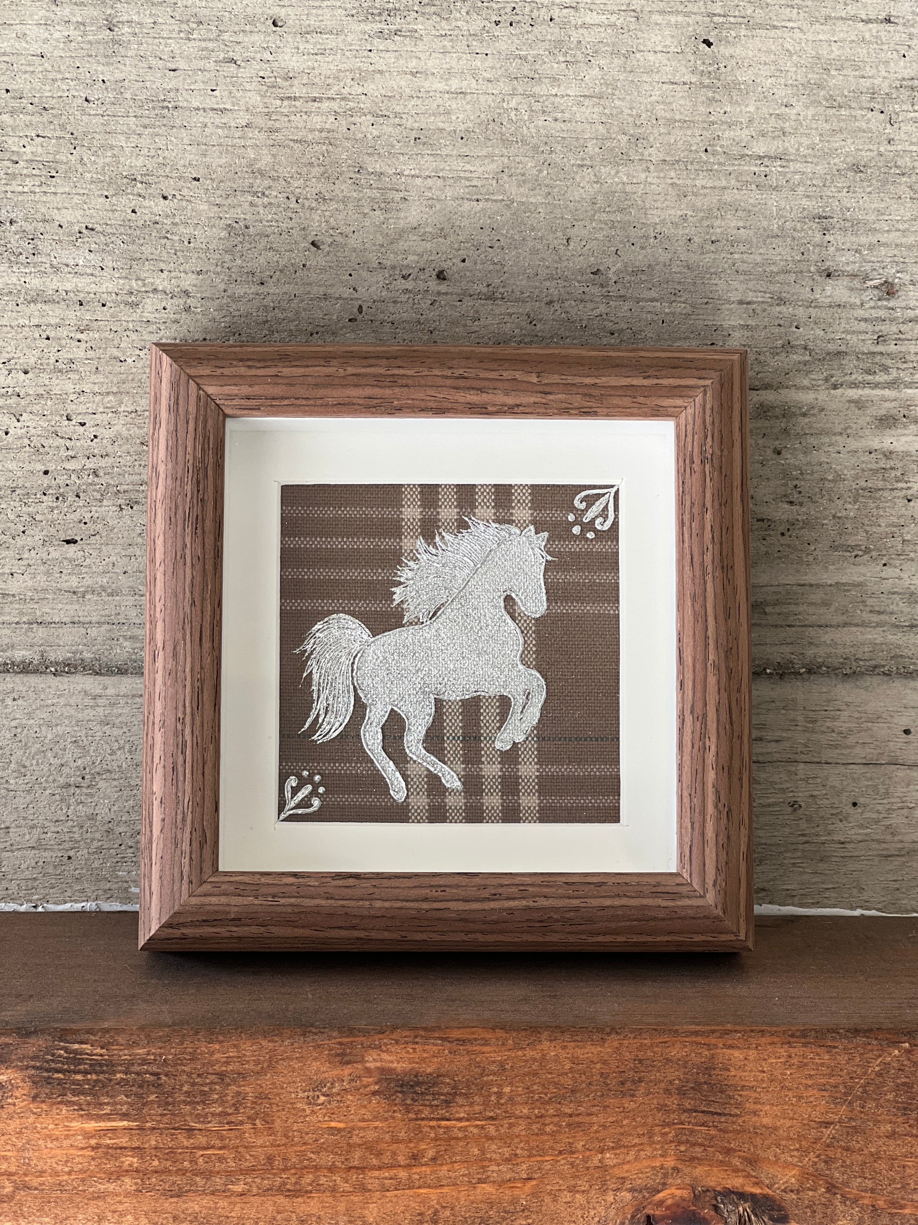 ベージュには“落ち着き”“希望”などの意味があります。そんなチェックの上を駆けるシルバーの馬が幸運を運んできそうなラッキーチャームのような作品です。