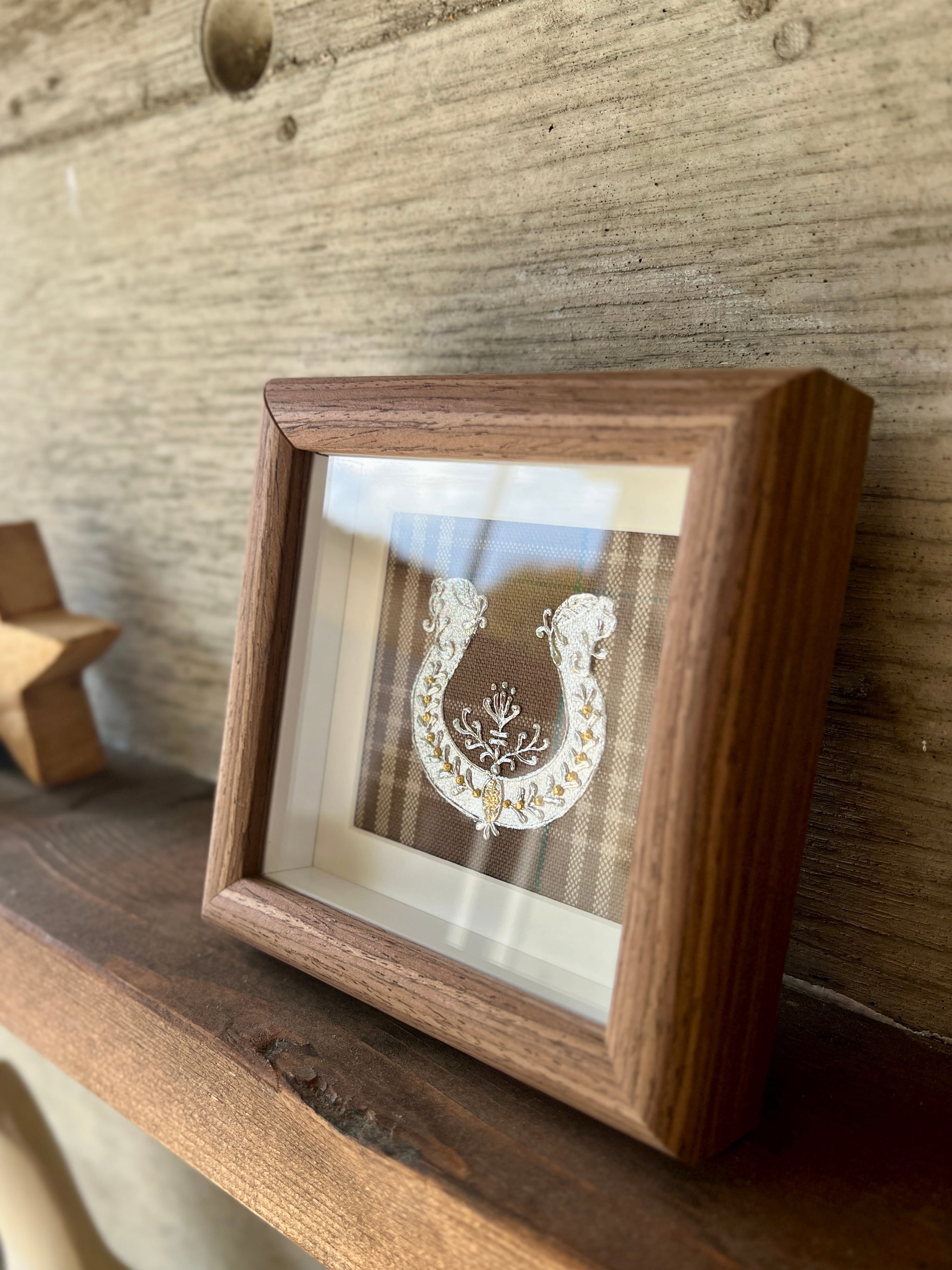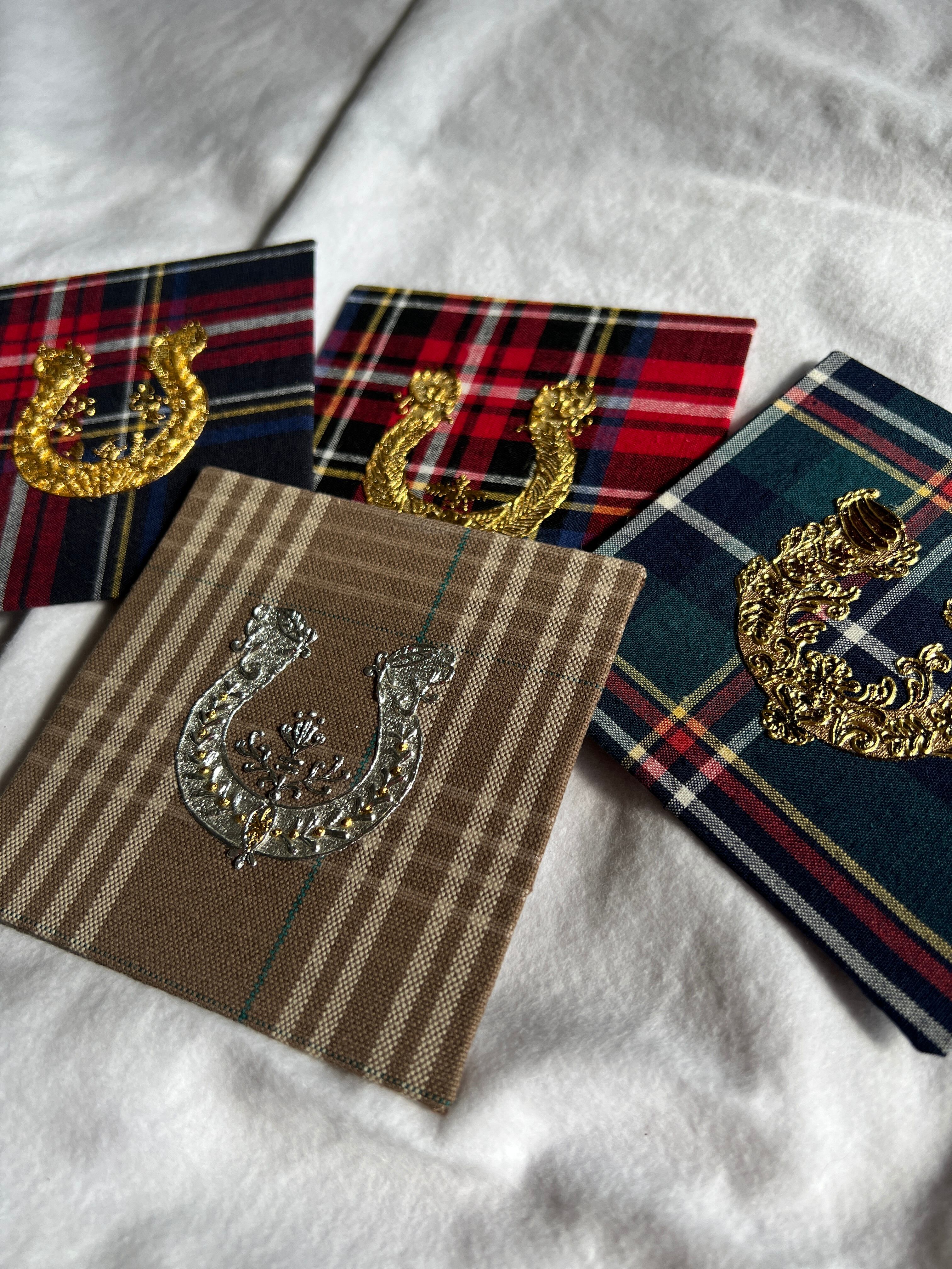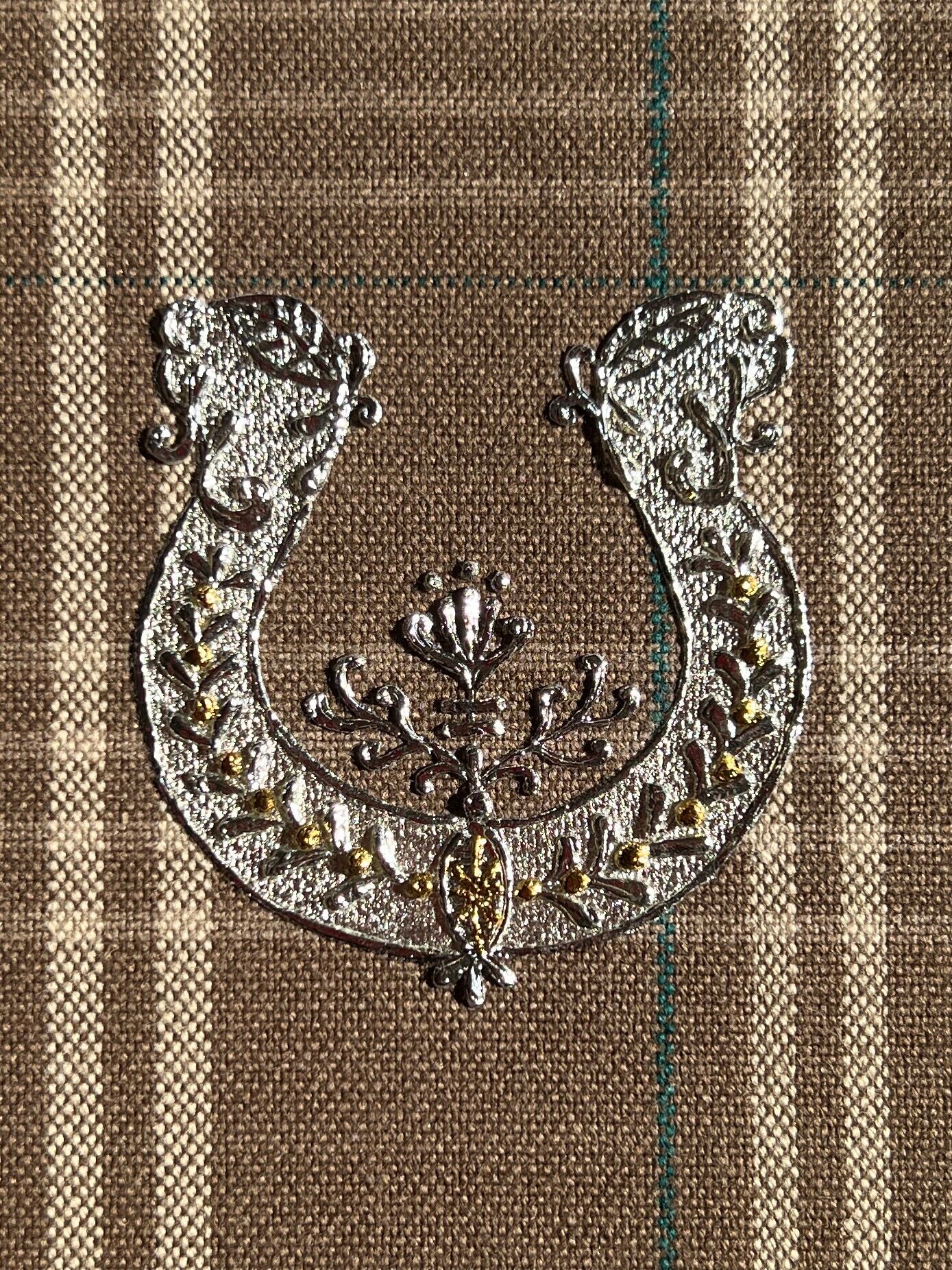 ベージュには“落ち着き”“希望”などの意味があります。そんなチェックの上に描かれたシルバーの蹄鉄が幸運を運んできそうなラッキーチャームのような作品です。