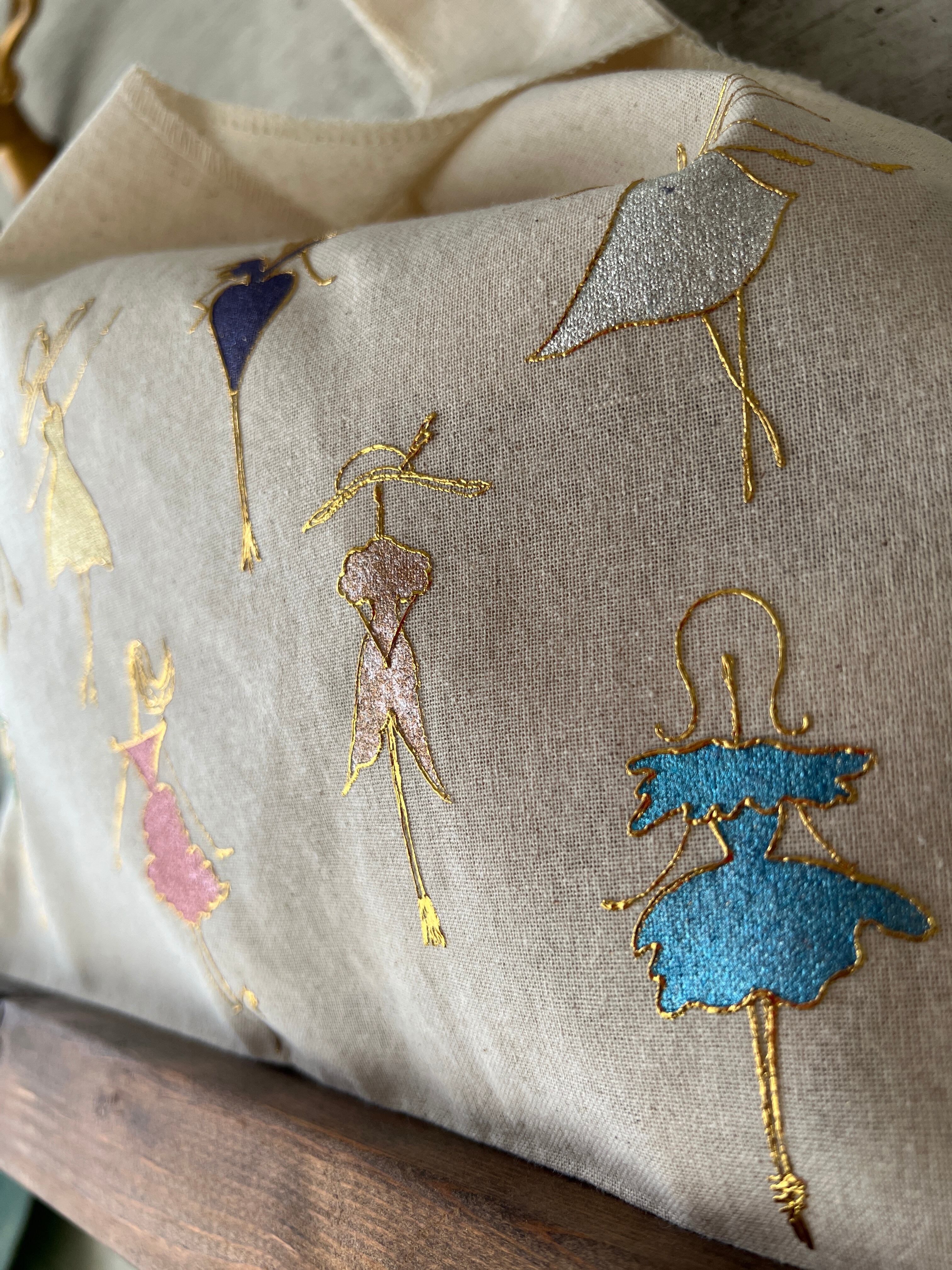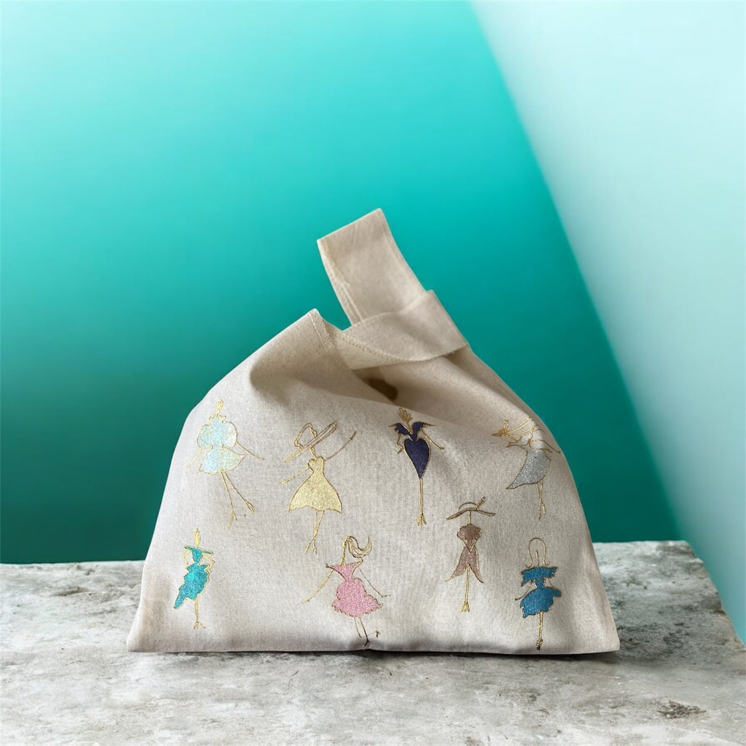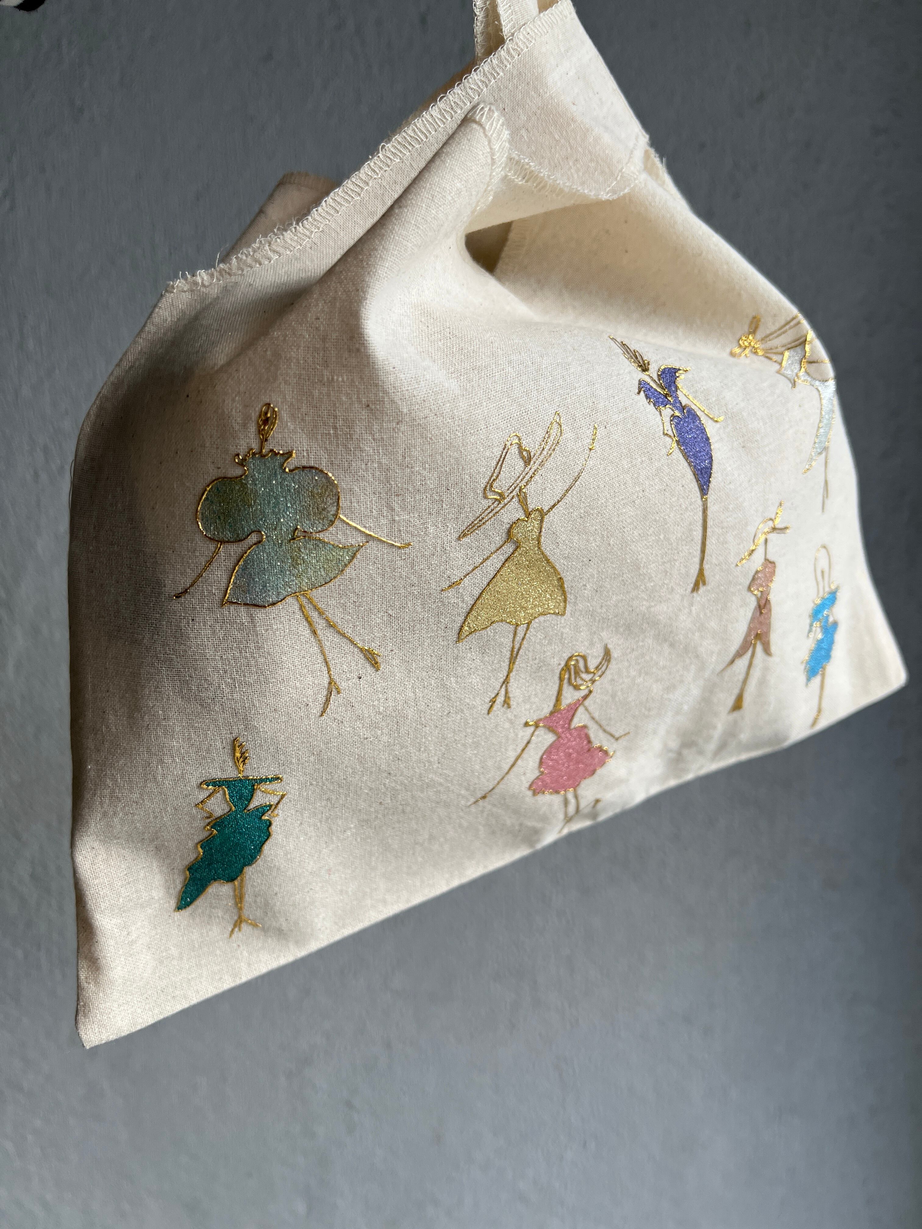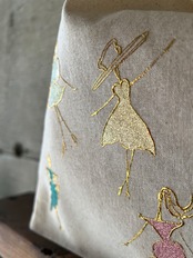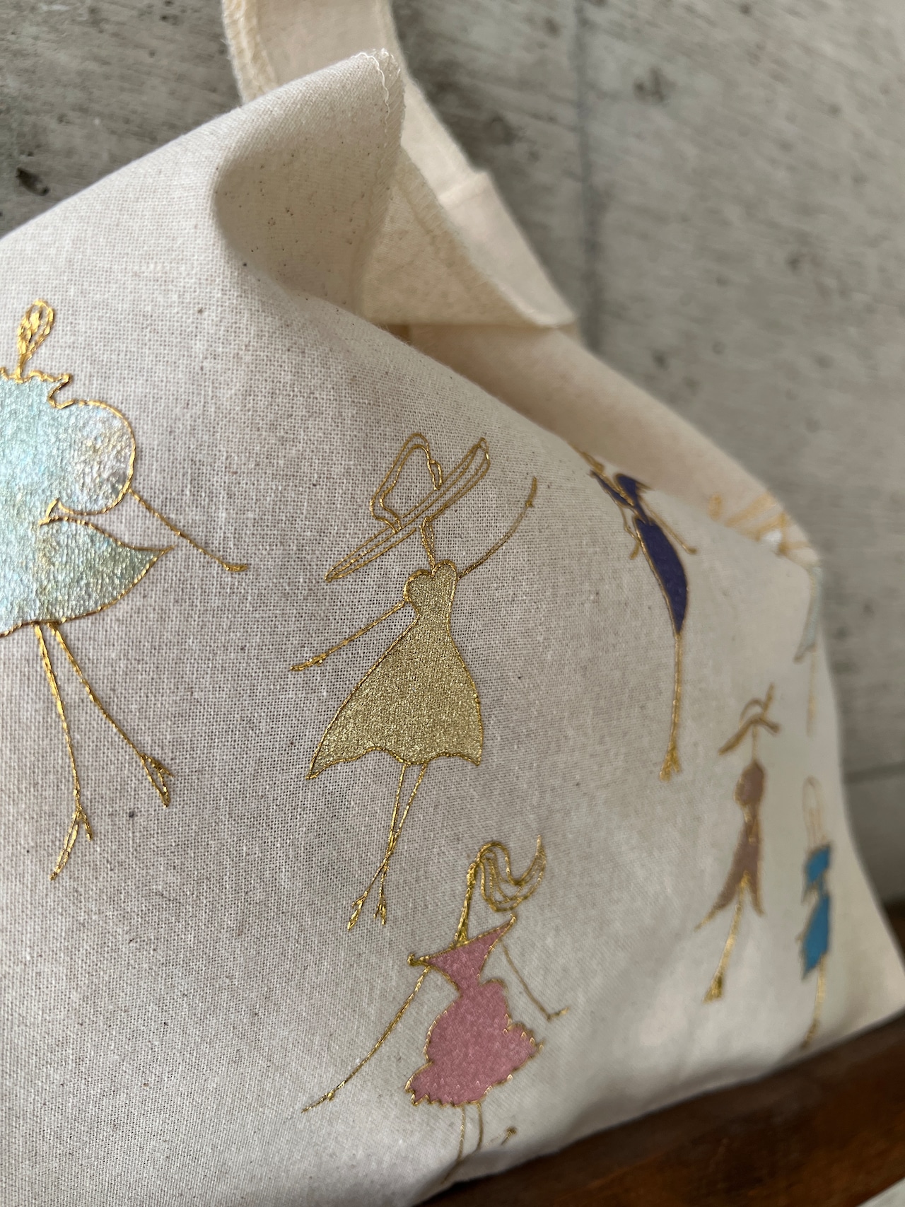 薄く柔らかくナチュラルな風合いのマルシェバッグ。そこに描かれたのはキラキラ輝く女性達。金や銀だけでなく色箔なども使用した女性達はひとつひとつがジュエリーのような存在感を放っています。サブバッグにもカジュアルな日のメインバッグにも◎