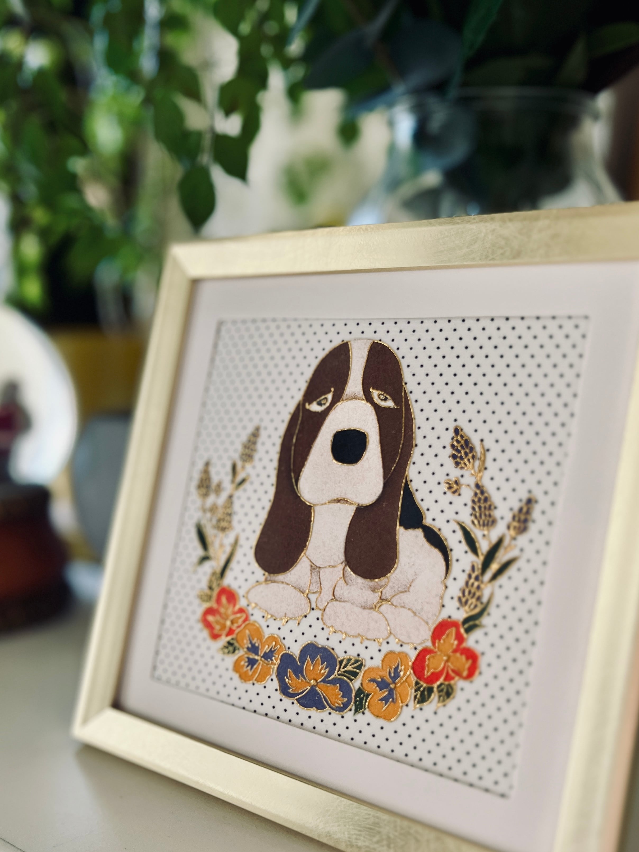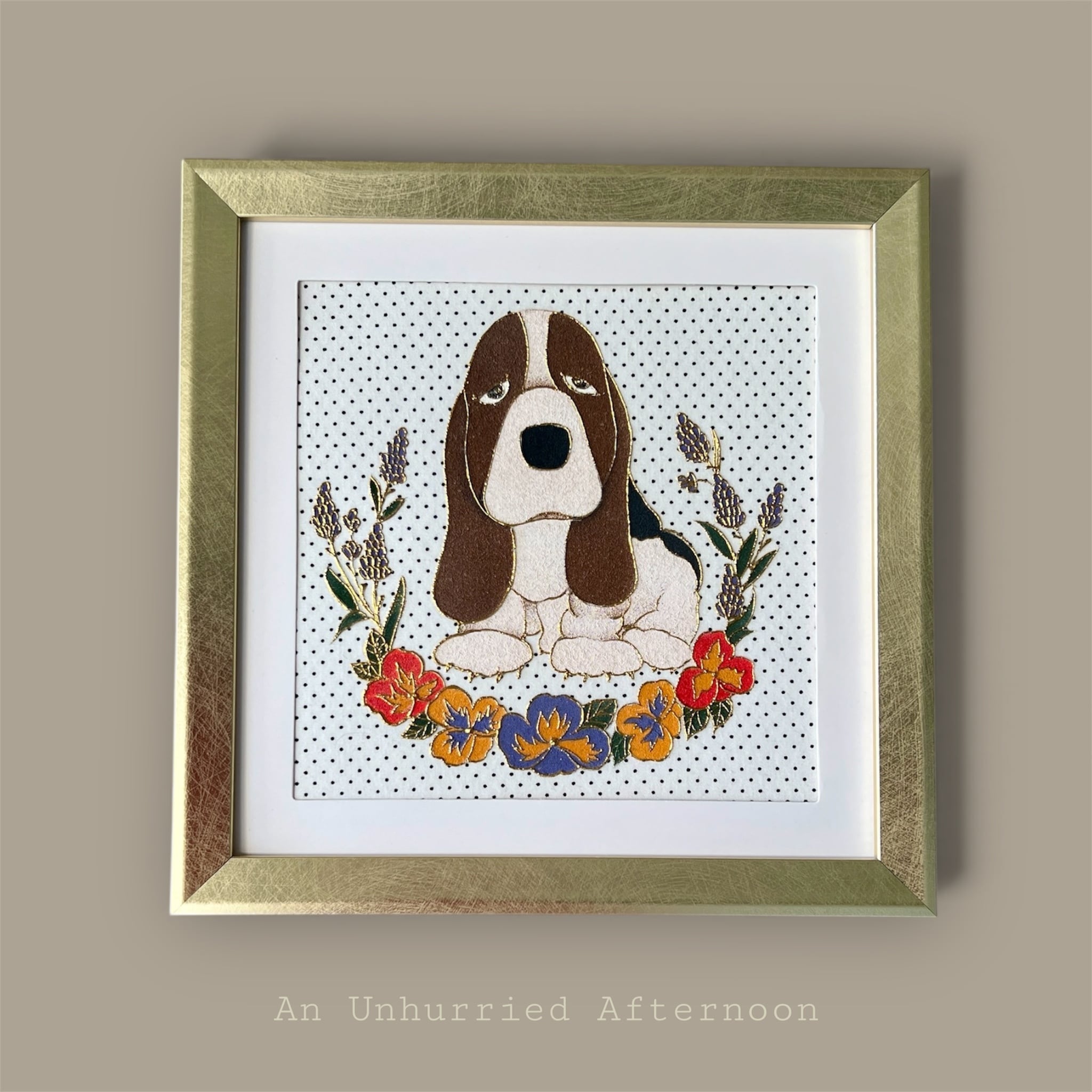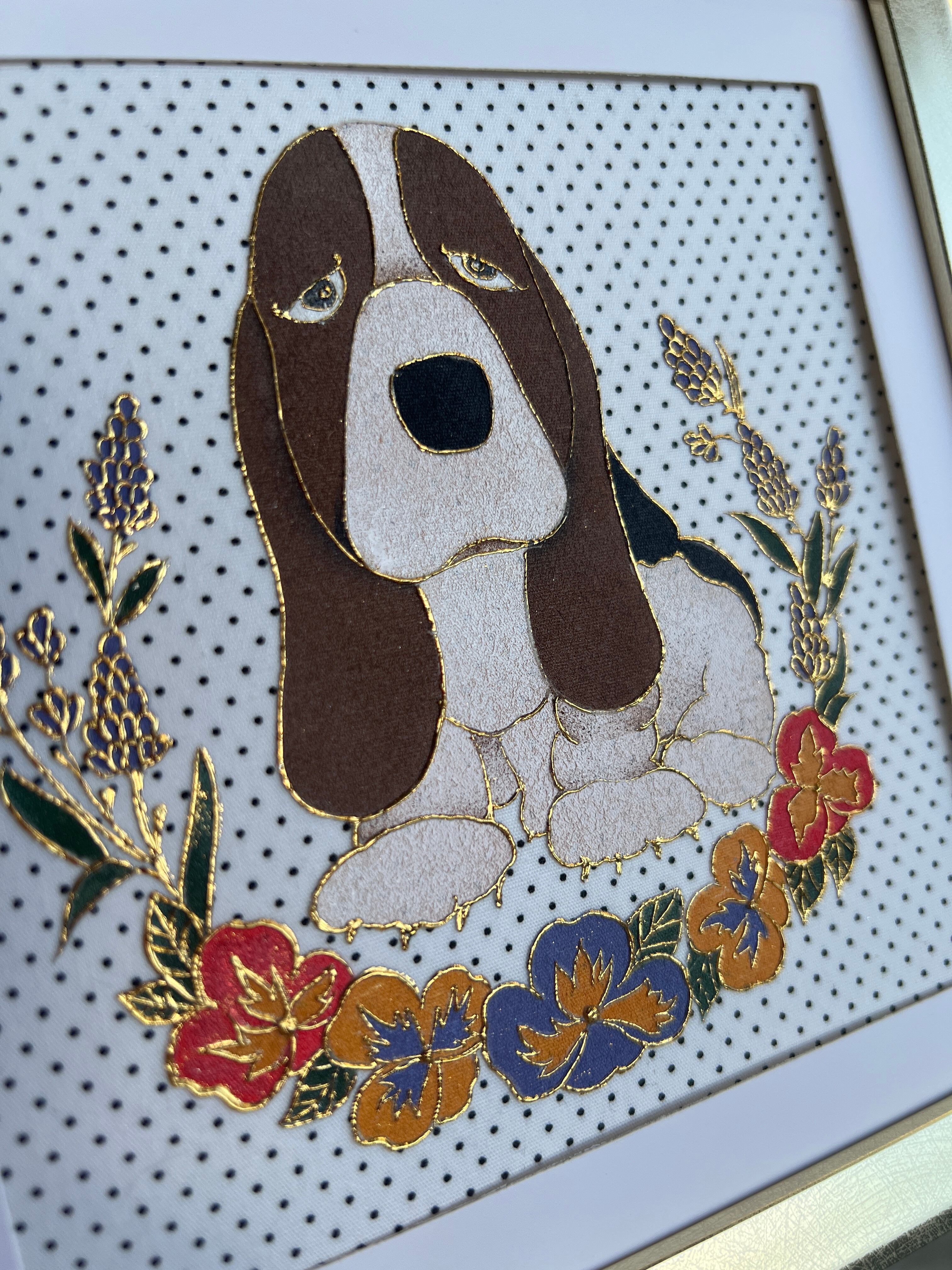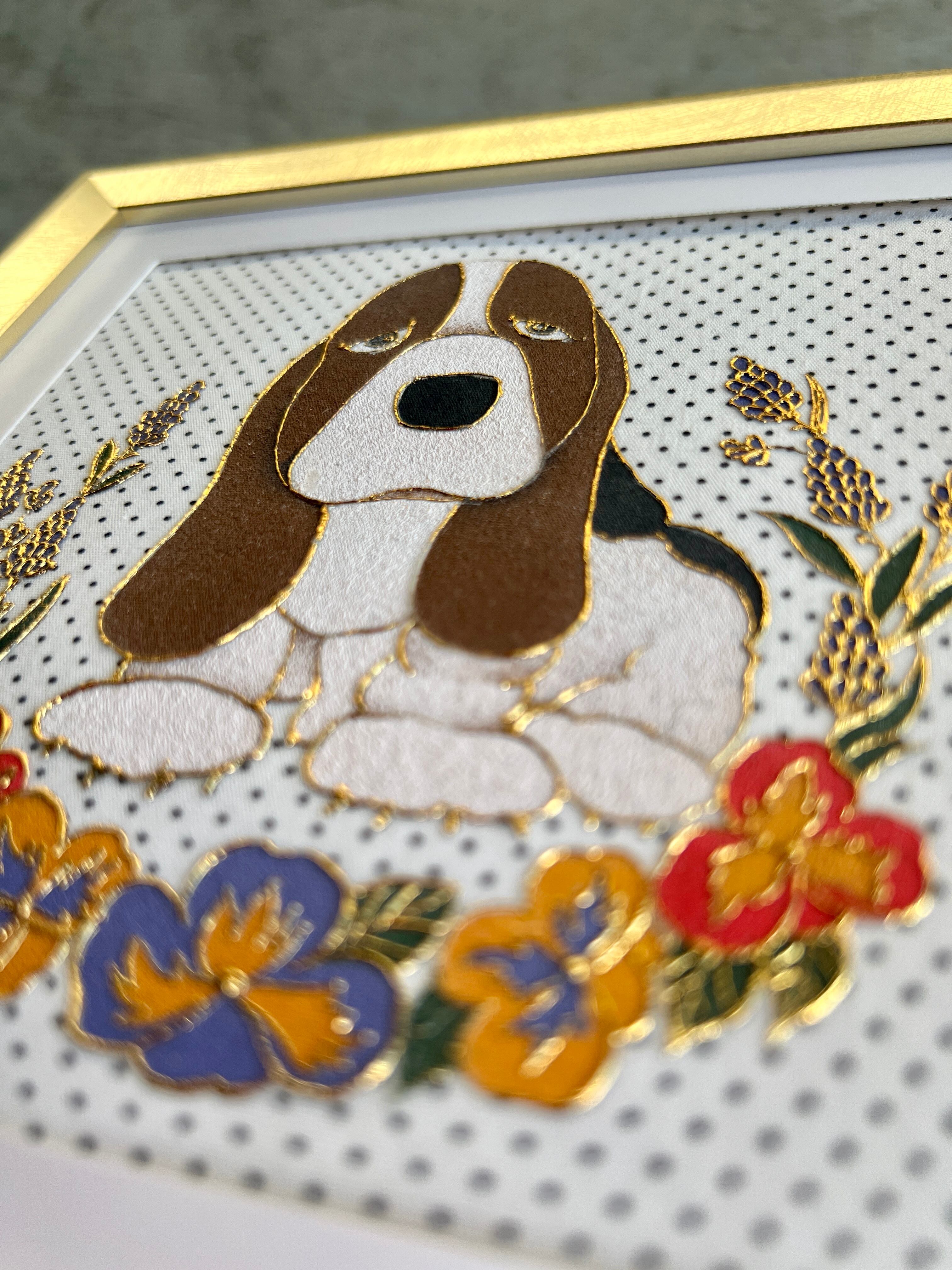 とろんとしたバセットハウンドの愛らしい表情とパンジーやラベンダーのコンビネーションが愛おしい作品です。伝統工芸“金彩”で彩られた動物や植物の煌めきを是非楽しんで下さい。
