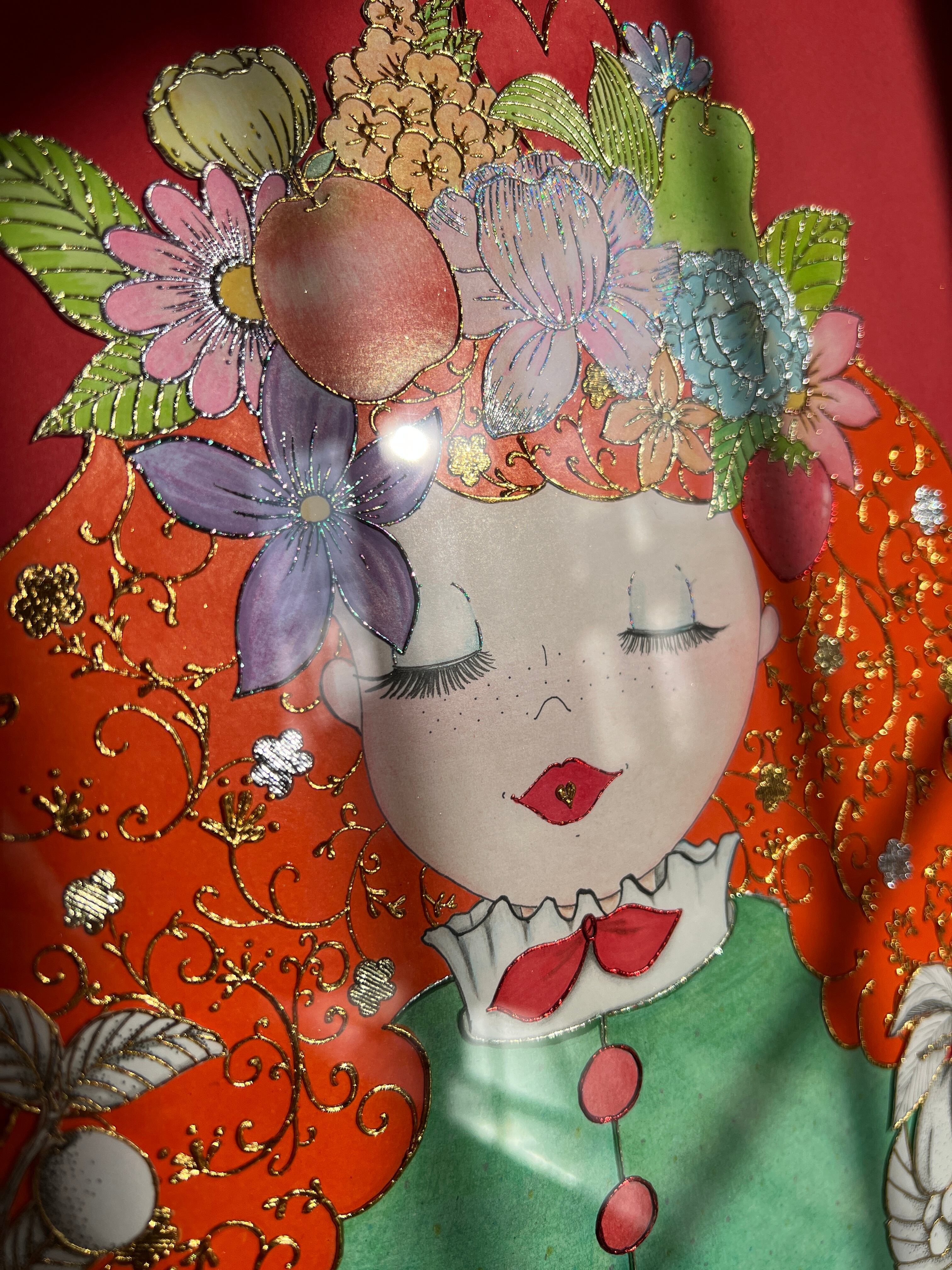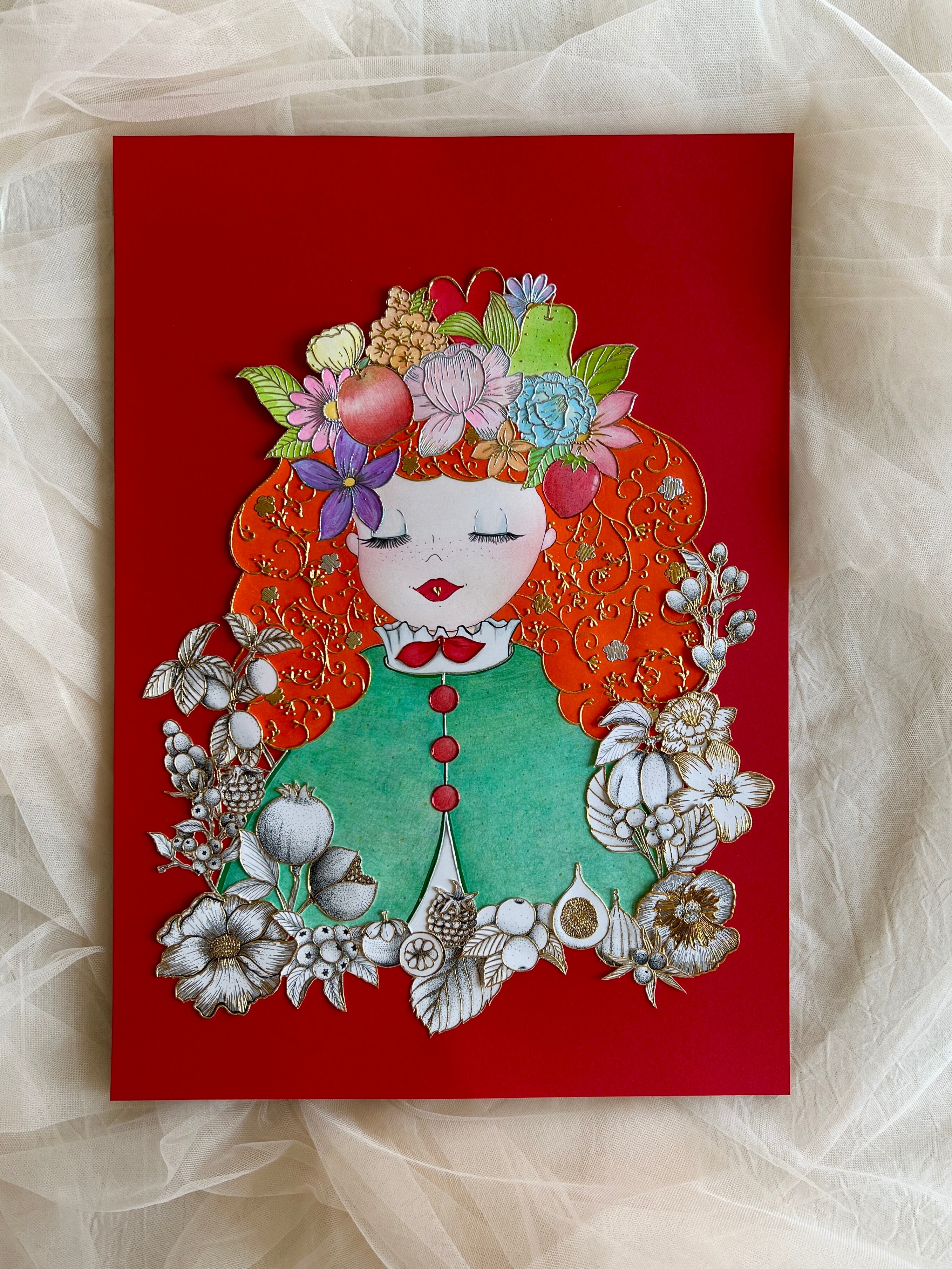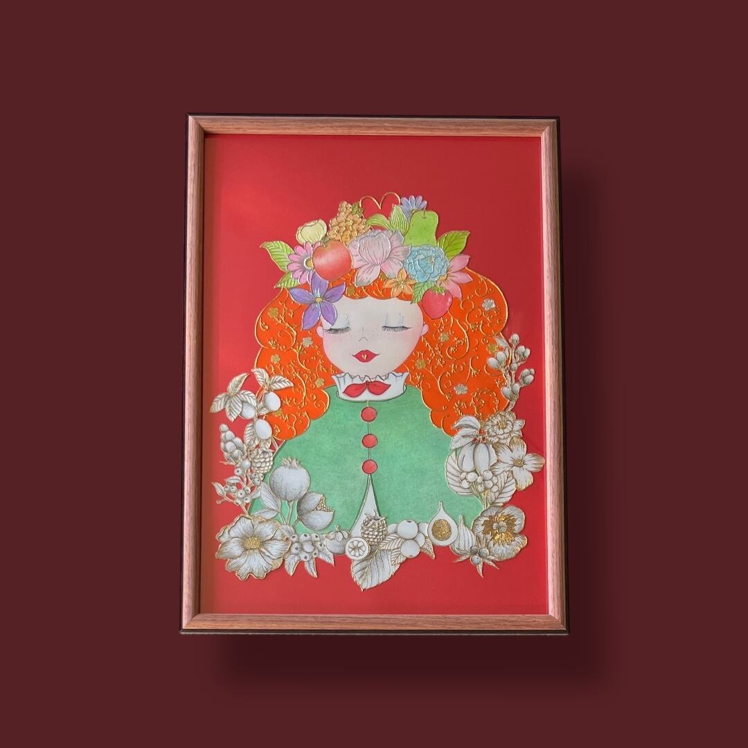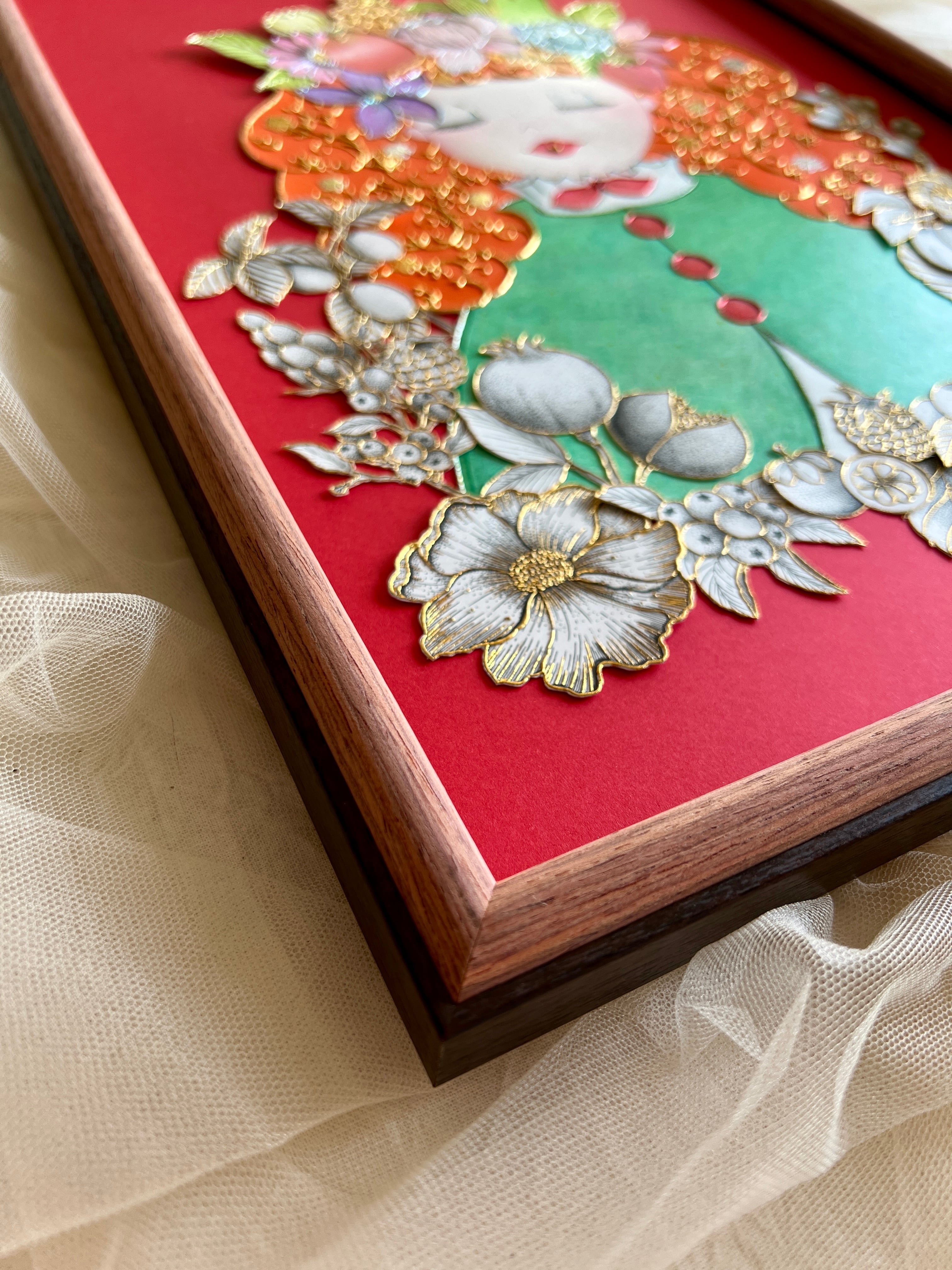 本来着物の上で輝く伝統技法の金彩が繊細な色鉛筆や発色の良いアルコールマーカーの上に置くことで新たな楽しさが生まれました。