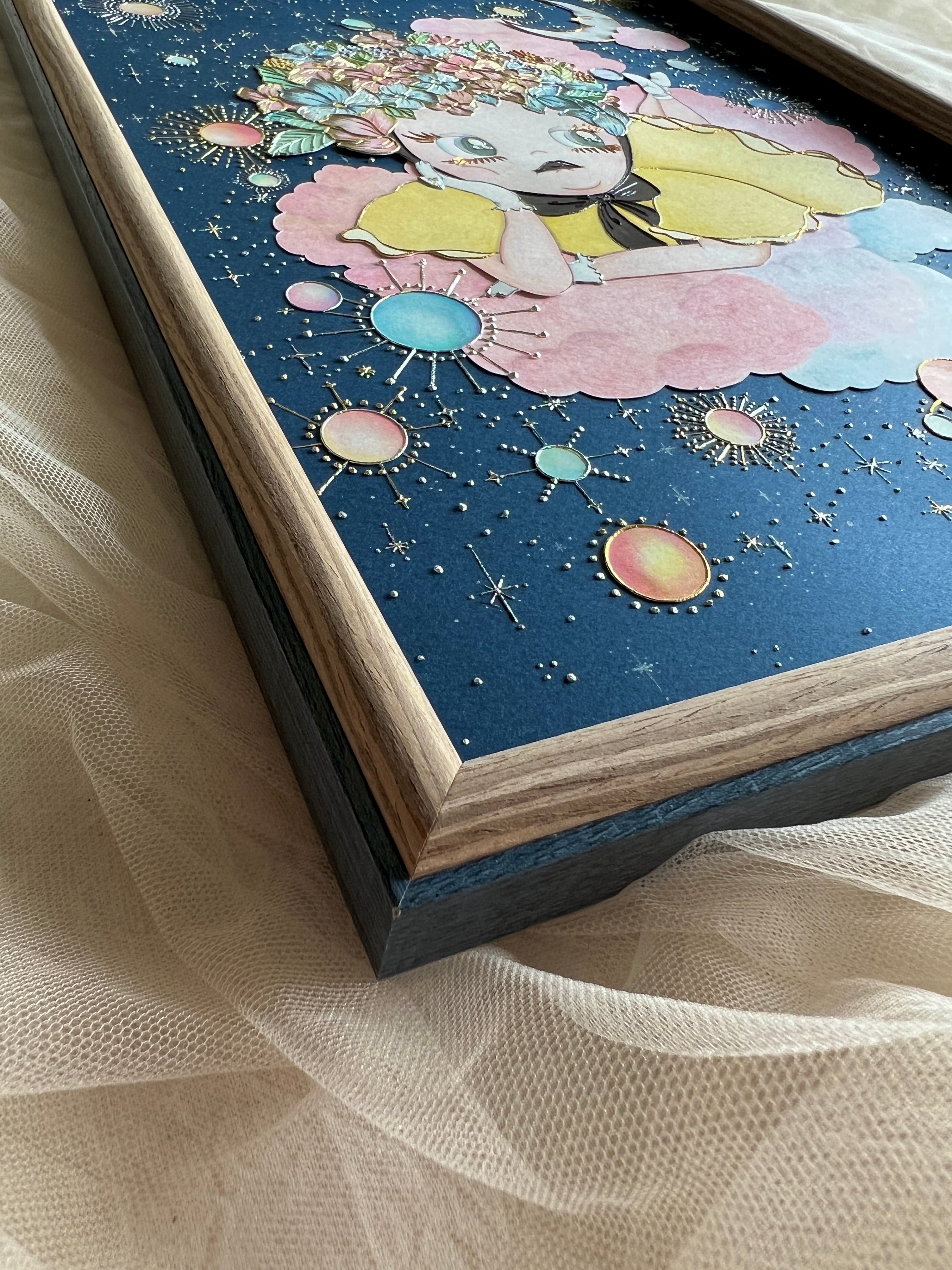 本来着物の上で輝く伝統技法の金彩が繊細な色鉛筆や発色の良いアルコールマーカーの上に置くことで新たな楽しさが生まれました。